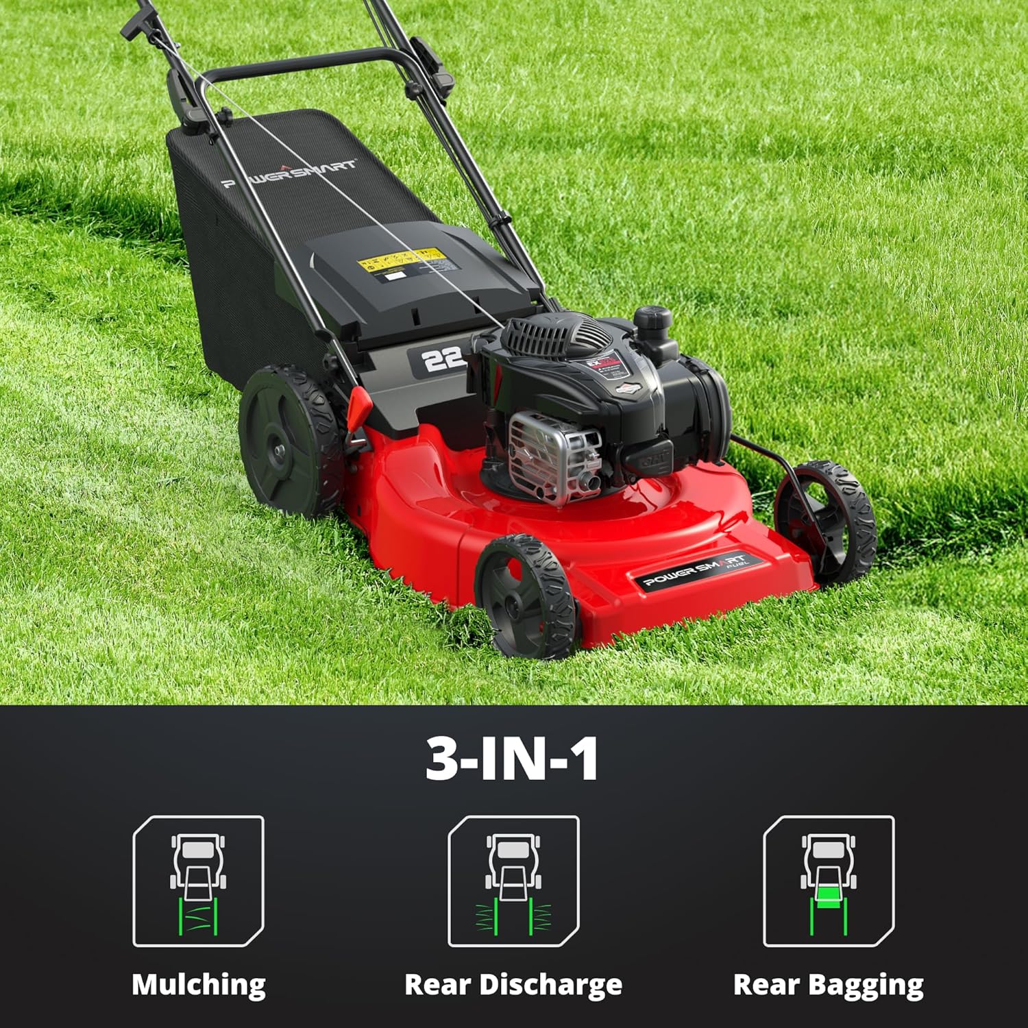 PowerSmart B8622S 22-Inch Gas Lawn Mower, 150cc B&S Engine, Self-Propelled, 3-in-1 Mulching System, 6 Cutting Heights, Rear-Wheel Drive, Durable Steel Deck