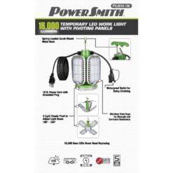 Introducing the All NEW 16,000 Lumen Pivotable LED JobSite Light from PowerSmith. Link up to 6 lights in ALL Weather conditions. Hang your New light in the garage, patio, pool side, or work shop area where 360° lighting is needed. Perfect for All Outdoor and wet Jobsite Conditions. Connect up to 6 lights with the linkable grounded 10 ft. Power Cord for all Weather use.