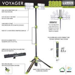 The New PowerSmith Voyager 8000 Lumen Collapsible LED Work Light with 3-Way Power options is the perfect solution for your commercial, industrial, job-site, and home project lighting needs. Whether you are Painting, Hanging drywall, Prepping the job site, Setting up a photo shoot, Lighting up a factory work station, Playing basketball in the driveway, Hosting a backyard barbeque, Playing volleyball at the beach, or Lighting up a campsite, the 4 adjustable light heads and telescoping tripod will project the light where it is needed. Your Voyager comes with a 12V 8.8Ah Li-Ion Battery that will power the light for 1-1/2 hours at the full 8000 lumens, and up to 6 hours at 2000 lumens on a single charge! You can also purchase an optional AC adapter and power your Voyager non-stop from any 120V electrical outlet or extension cord. And you can purchase an optional DC adapter and power your Voyager with a Makita, DeWalt, or Milwaukee Power Tool Battery! The Voyager 8000 Integrated Aluminum Tripod Telescopes the light up to 79″ Tall and also folds down into a super-compact tube for transportation and storage. At 4-1/2″ by 33″ and weighing only 9.5 lbs., the collapsed Voyager can be moved and stored easily -place it in the cab of your truck instead of in the back, where it can get damaged or stolen. Model PVLR8000A Voyager comes with battery, charger, carrying bag, shoulder strap, foot spikes, and remote to control the light modes and power on/off. No Tools or Assembly required.