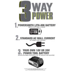 - OPTIONAL 3-WAY POWER – Operates using PowerSmith PVLAB121 Li-ion battery (Included), standard 120V wall AC power (Requires purchase of AC adaptor), or an 18V/20V power tool battery: Makita, Milwaukee or DeWalt (Requires purchase of DC adaptor for each power tool brand)