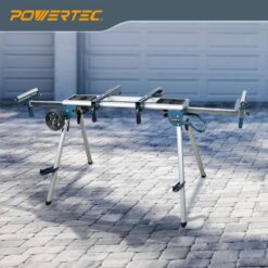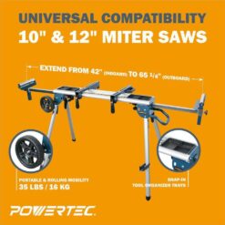 The Deluxe Rolling Miter Saw Stand with Trays by POWERTEC Handy Universal Design The POWERTEC MT4008 aluminum Miter saw stand with Trays offers the user easy, lightweight stand portability to and from the jobsite, while at the same time providing the rugged work-platform stability you need to get the job done, even in your most demanding applications. This Monster workstation handles a weight capacity of 330 lbs. This choice stand works with many brands of Miter saws. The extendable stock-feed rollers operate in both vertical and horizontal positions for maximum versatility. At project’s completion, this premium stand folds up Flat and compact, thus insuring easy stand transfer and efficient storage. 2 convenient tabletop snap-in tool trays are included for instant tool access. They are positioned on the metal screen (below the rails) so they will not interfere with the adjustment of your saw. Fold out material supports are mounted to the legs for convenient storage and easy access of materials up to 4-3/4 in. W addition, with integrated material stops, uniform and repeated cuts can quickly and easily be executed. Set-up is a cinch. Just activate the handy locking-lever mechanism that efficiently locks the stand legs firmly in place. Firm-grip rubber-stop feet further enhance crucial stand integrity.
