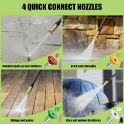 - [4 Universal Tips] The 0° tip delivers super high pressure for dissolving stubborn substances on hard surface. The 15° tip delivers high pressure for concrete bric with hard surface. The 25° tip delivers medium pressure for wood decks, viynl sidings with soft surface. The 40° tip provides low pressure for windows and screens with fragile surfaces.