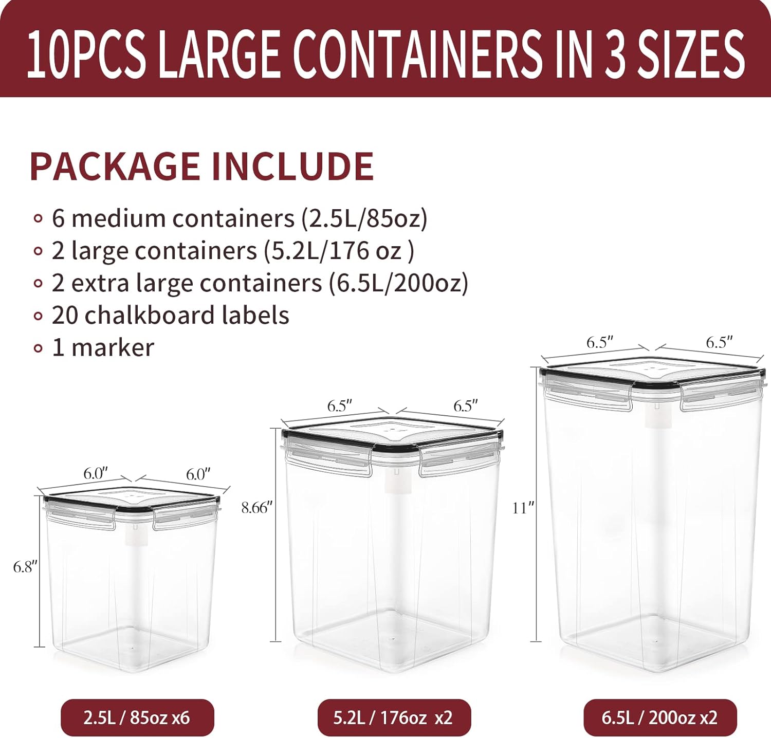 - Just the Right Containers: The flour and sugar containers set included 2 pcs EXTRA LARGE size 6.5L/220oz, 2 pcs LARGE size 5.2L/176oz and 6 pcs MEDIUM size. Extra gift( White pen + 20 Pcs Blackboard labels), which is very suitable for storing daily food