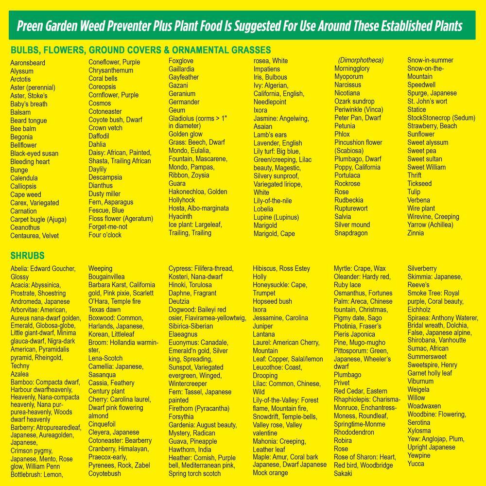Garden Weed Preventer plus Plant Food prevents weeds and feeds plants in one easy step. Balanced fertilizer promotes abundant blooms, increased yields and strong root development. Safe for use around over 200 established flowers, vegetables, trees and shrubs. One application fertilizes your plants and prevents weeds for up to three months.