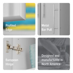 - Light gray laminate finish with satin nickel-finished metal handles