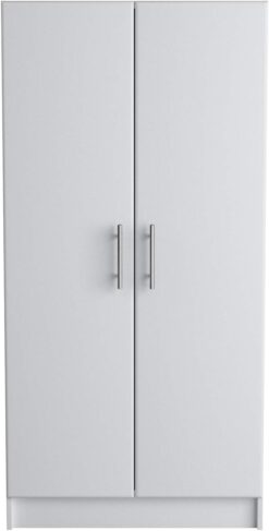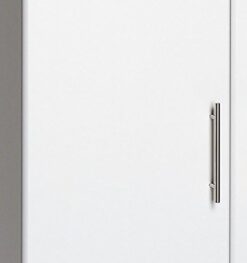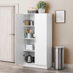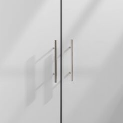 - FREESTANDING STORAGE CABINET: Features 2 soft-edge doors on adjustable 6-way European style hinges, 2 adjustable shelves, and one fixed shelf all in a crisp white laminate finish with satin nickel-finished metal handles