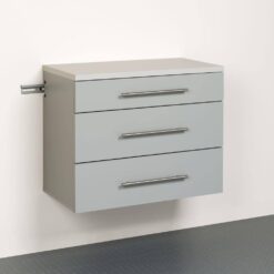 The HangUps 3 Drawer Base Cabinet offers versatility for your ever changing storage needs in the garage, laundry room, office or workshop. This cabinet is constructed using laminated composite wood and features 3 sturdy drawers with 1/2 in. drawer bottoms and metal drawer sides. The Base Cabinet mounts securely to the wall with a heavy duty metal rail and hook system. The wall mounted feature ensures easy cleaning beneath the cabinets and protects your stored items from water & dirt. This product ships ready-to-assemble and includes all hanging rails and fastening bolts. Add other cabinets from our HangUps Collection to create a storage system to convert any cluttered room into an organized space.