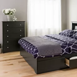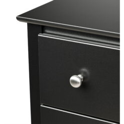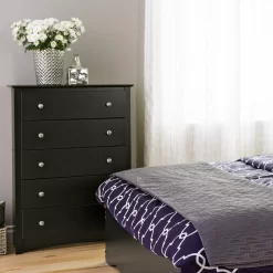 Put a modern spin on your classic staple with the Prepac Sonoma 5 Drawer Chest. A profiled flat top, sleek side moldings, and curved kick plate form a contemporary and modern design with a black laminate finish that makes this a beautiful and chic bedroom chest dresser. Tall and narrow, this chest houses five full-size storage drawers for clothes, running on smooth roller glides with built-in safety stops and accented with brushed nickel metal knobs. This compact multi-drawer organizer is a space-saving clothes organizer for bedrooms, but it also makes for an excellent storage cabinet in your walk-in closet, nursery, living room, or entryway. This versatile standing chest of drawers can also act as a TV stand or a display for small lamps, electronics, picture frames, and more. Made from a non-toxic laminated composite wood with a sturdy back panel, this chest will reliably protect your clothing. This high-quality chest ships flat packed and can be assembled in two hours or less. Measuring 16″ D x 31.5″ W x 45.25″ H with each deep drawer measuring 12.5″ D x 24.75″ W x 5″ H, this vertical standing chest is a must-have piece of bedroom furniture. Pair this all-purpose chest with other items from the Sonoma collection for a uniform bedroom set that accommodates your complete wardrobe.