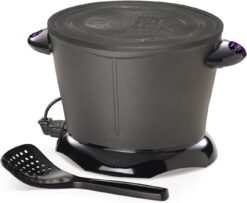 - Dual-compartment black bucket-style countertop electric deep fryer