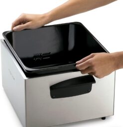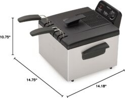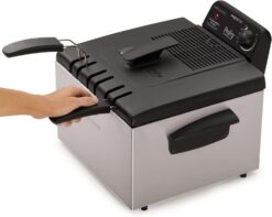 - Professional-style deep fryer with dual baskets for easy at-home frying.