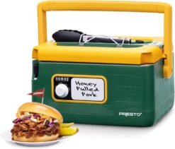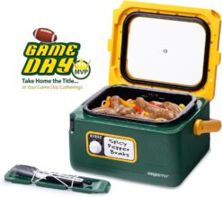 Slow cook foods and take them on the road with confidence in the Presto® Nomad® traveling slow cooker. Styled in sporty green and gold cool-touch housing, this rugged 8-quart slow cooker is ideal for big batches of pulled pork, chicken wings, sloppy joes, hot beef, soups, stews, and casseroles. Great for game day gatherings at home or away! Identify the food or write a clever message with the dry erase marker and board. When on the go, the swing-up handle with seal-tight gasket locks the lid making it easy to carry, and the wide-profile design with built-in cord storage helps to prevent tip-overs. The detachable utensil holder secures a utensil for transit and also doubles as a spoon rest for serving. Both the PFAS-free porcelain enameled pot and cover are removable for easy cleanup.