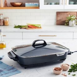 - Roasts, fries, grills, stews, bakes, makes casseroles and one-dish meals. Luxurious tempered glass cover. Deluxe nonstick surface inside and out