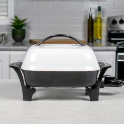 This Presto® 11-inch electric skillet is handy for every meal! It roasts, fries, grills, stews, bakes, makes casseroles and more. The high-sidewall pan and high-dome cover offer greater food capacity for everyday meals and entertaining. Nonstick surface, inside and out, provides stick-free cooking and easy cleaning. The durable Ever Nu™ white cover won’t dent, warp, peel, or bend, and the heavy cast aluminum base is virtually warp-proof. Control Master® heat control automatically maintains the desired cooking temperature. Saves energy too—it’s more efficient to use than a range burner or oven! Fully immersible and dishwasher safe with the heat control removed.