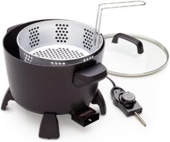 This extra-large multi-cooker/steamer with tempered glass cover steams, stews, roasts, boils, deep fries and more. The Big Kettleâ„¢ multi-cooker is 60% bigger than our classic Kitchen Kettle. It deep fries up to 8 cups of food, cooks soups and casseroles, steams vegetables, cooks rice and pasta, and roasts beef, pork, and poultry. Enjoy stick-free cooking and easy cleaning with the nonstick surface, inside and out. It’s so versatile you’ll use it every day! The steam/fry basket is perfect for steaming, blanching and frying, and the basket hooks onto the side of the multi-cooker for easy draining. Accurate cooking temperatures are maintained with the Control Master® heat control. Heavy cast aluminum base provides even heat distribution. Fully immersible and dishwasher safe with the heat control removed.