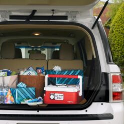 Slow cook foods and take them on the road with confidence in the Presto® Nomad® traveling slow cooker. Brightly styled with red cool-touch housing, this rugged 6-quart slow cooker is ideal for pulled pork, chicken wings, sloppy joes, hot beef, soups, stews, and casseroles at home or away. Identify the food or write a clever message with the dry erase marker and board. When on the go, the swing-up handle with seal-tight gasket locks the lid making it easy to carry, and the wide-profile design with built-in cord storage helps to prevent tip-overs. The detachable utensil holder secures a utensil for transit and then doubles as a spoon rest for serving. Cleanup is easy too, both the PFAS-free porcelain enameled pot and hinged cover are removable.