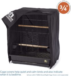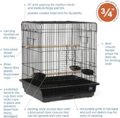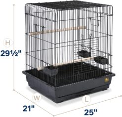 Prevue Pet Products Square Roof Parrot Cage in Black SP25217B/B offers plenty of space for your small parrot to play You can easily access your bird through the large landing style front door and cleaning is simple thanks to the removable bottom grille and pull out tray. Three heavy duty plastic dishes and two perches are included in this Square Roof Parrot Cage which measures 25-inch L, 21-inch W, 29 1/2-inch H with 3/4-inch wire spacing.