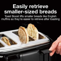 - EASILY RETRIEVE SMALLER-SIZED BREADS: The Toast Boost feature on the 4 slice toaster lifts smaller breads like English muffins so they’re easier to retrieve after toasting.