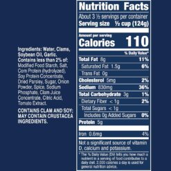 Water, Clams, Soybean Oil, Garlic. Contains less than 2% of: Modified Food Starch, Salt, Corn Protein (hydrolyzed), Soy Protein Concentrate, Dried Parsley, Sugar, Onion Powder, Spice, Sodium Phosphate, Clam Juice Concentrate, Citric Acid, Tomato Extract.