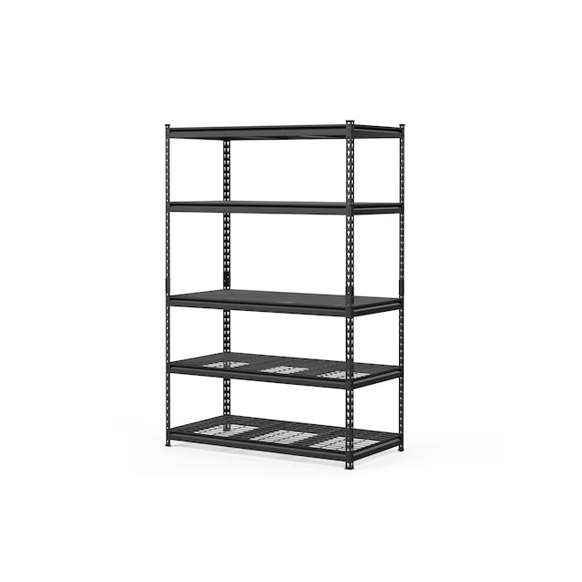 The Project Source 5-tier boltless steel shelving unit can be assembled vertically as a 72 in. high freestanding shelving or as two individual 36 in. high workbenches. Five adjustable wire grid shelves can support up to 1000 lbs. per shelf with the weights evenly distributed, enabling you to store a large number of household and personal items. The product is made from powder-coated finish for resistance to stains or corrosion. The shelves are adjustable in 1-1/2-in increments to accommodate your storage needs. Boltless design provides easy and quick assembly and no special tools are required. The durable wire shelves provide better visibility, air flow and less dust accumulation. Plastic feet make the unit more stable and protect flooring from indentations or scratches, and also ensure ease of movement.