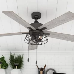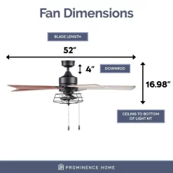 Prominence Home ceiling fans provide comfort for your home all year long but can also help to reduce energy costs. Enjoy the welcome breeze in any room of your home while looking stylish. This industrial style multi-position indoor ceiling fan combines stylish details of metal and wood for a truly inspiring fixture for your home. The Marshall features a cage inspired metal shade with LED Edison bulbs The innovative 5-blade design provides ultra-efficient, adjustable and energy efficient airflow while the LED lights provide ideal lighting to fit your mood. Control your ceiling fan with the traditional pull chain. Compatible with universal ceiling fan remotes. Enjoy year-round comfort by adjusting the reversible airflow switch that easily allows you to change the direction of the fan to properly distribute air. During hot summer months it will provide a cooling effect or when reversed, spreading warm air in the winter to help reduce energy costs. Specifications: Sizing: 52 inch 5-blade indoor fan for rooms up to 400 sq. ft. Lighting: 2 x E26/ST19 light bulbs included that provide 450 lumens, 4.5 watts, 2700k color temperature. About Prominence Home Ceiling Fans Prominence Home offers an assortment of decorative and functional ceiling fans in various sizes and specifications. Our goal is to ensure your choice of indoor or outdoor fan delivers optimum performance for your room’s size. All Prominence Home ceiling fans deliver maximum airflow with adjustable wind speeds. We design our products with high-quality materials that are durable and long-lasting. Whether you’re building a new home or renovating your current space, trust Prominence Home ceiling fans to deliver a great look and last for years to come while fitting any budget.