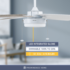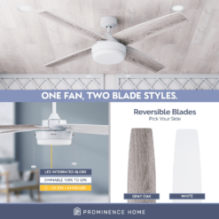The Prominence Home Memphis indoor ceiling fan has a minimalistic charm and modern appeal certain to fit flawlessly in your contemporary spaces. This 52-inch ceiling fan is sculpted with rounded edges perfectly balanced by high contrasting blade angles. Its sleek cylindrical body houses a powerful, integrated dimmable LED light adding simplicity to style. This contemporary fan features a beautiful bright white body expertly designed with four clean-lined, reversible blades with a different finish on each side. One side comes in a beautiful gray oak finish that pairs well with farmhouse and coastal styles, while the other side showcases a white finish which harmonizes well with modern and coastal aesthetic – the choice is yours! The robust motor and design provides adjustable, reversible air movement that is ultra-efficient whether you want to cool down on those sweltering summer days or circulate warm air in the cold months of winter. To ensure your long-term satisfaction, this fan is backed by a limited lifetime warranty. The Prominence Home Atlas gives you all the quality functions you deserve while providing the impressive eye-catching style you crave.