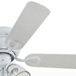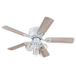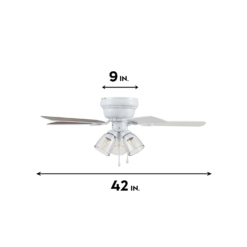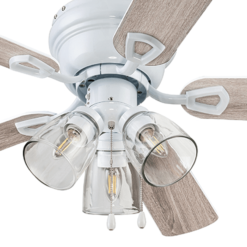 COASTAL/FARMHOUSE: With a beautiful white finish and wood toned blades the Renton traditional style ceiling fan pairs perfectly with both casually coastal and charming farmhouse spaces. Having a blade span of 42 inches, this fan is perfect for medium to small rooms such as smaller bedrooms, dens, and much more! CLEAR GLASS: This indoor ceiling fan features a clear glass branched light kit housing 3 E26/Medium (Standard)/B11 bulbs(included). LOW-PROFILE DESIGN: Flush mount ceiling fan, built for rooms where extra space is needed This low profile ceiling fan is a compact cool solution to adding comfort to rooms with low ceilings. DUAL-FINISH REVERSIBLE BLADES: The style is up to you! This ceiling fan comes with a different finish on each side of the blades. One side comes in a beautiful White finish, while the other side showcases a complementary Gray Oak finish. Pick the look that best fits your space!