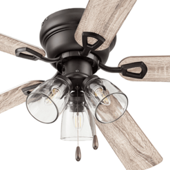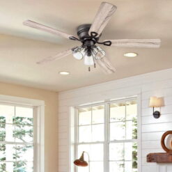 TRADITIONAL/FARMHOUSE: The Renton farmhouse ceiling fan showcases a beautiful Espresso Bronze – perfect for those inviting farmhouse spaces. Having a blade span of 52 inches, this fan is perfect for medium to large rooms such as bedrooms, living rooms, dining rooms and much more! CLEAR GLASS: This indoor ceiling fan features a clear glass branched light kit housing 3 E26/Medium (Standard)/B11 bulbs(included). LOW-PROFILE DESIGN: Flush mount ceiling fan, built for rooms where extra space is needed This low profile ceiling fan is a compact cool solution to adding comfort to rooms with low ceilings. DUAL-FINISH REVERSIBLE BLADES: The style is up to you! This ceiling fan comes with a different finish on each side of the blades. One side comes in a beautiful Dark Chestnut finish, while the other side showcases a complementary Rough Pine finish. Pick the look that best fits your space! EASY TO USE: This flushmount ceiling fan uses pull chains for quick and easy on and off adjustments. QUIET, REVERSIBLE MOTOR: Conveniently quiet, 3 speed – reversible motor. Run counter-clockwise in the summer to produce a cooling downdraft. Can be run clockwise in the winter to aid in circulating warm air and cutting down on energy costs. LIMITED LIFETIME WARRANTY: A Limited Lifetime warranty is offered on this product by the manufacturer.