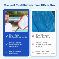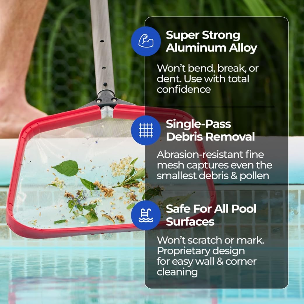 - HEAVY-DUTY ALUMINUM FRAME – Built to last, this pool skimmer features a reinforced aluminum alloy frame that won’t bend under heavy loads. Designed for durability, this pool cleaning net is perfect for both residential and commercial pools, ensuring effortless maintenance season after season.