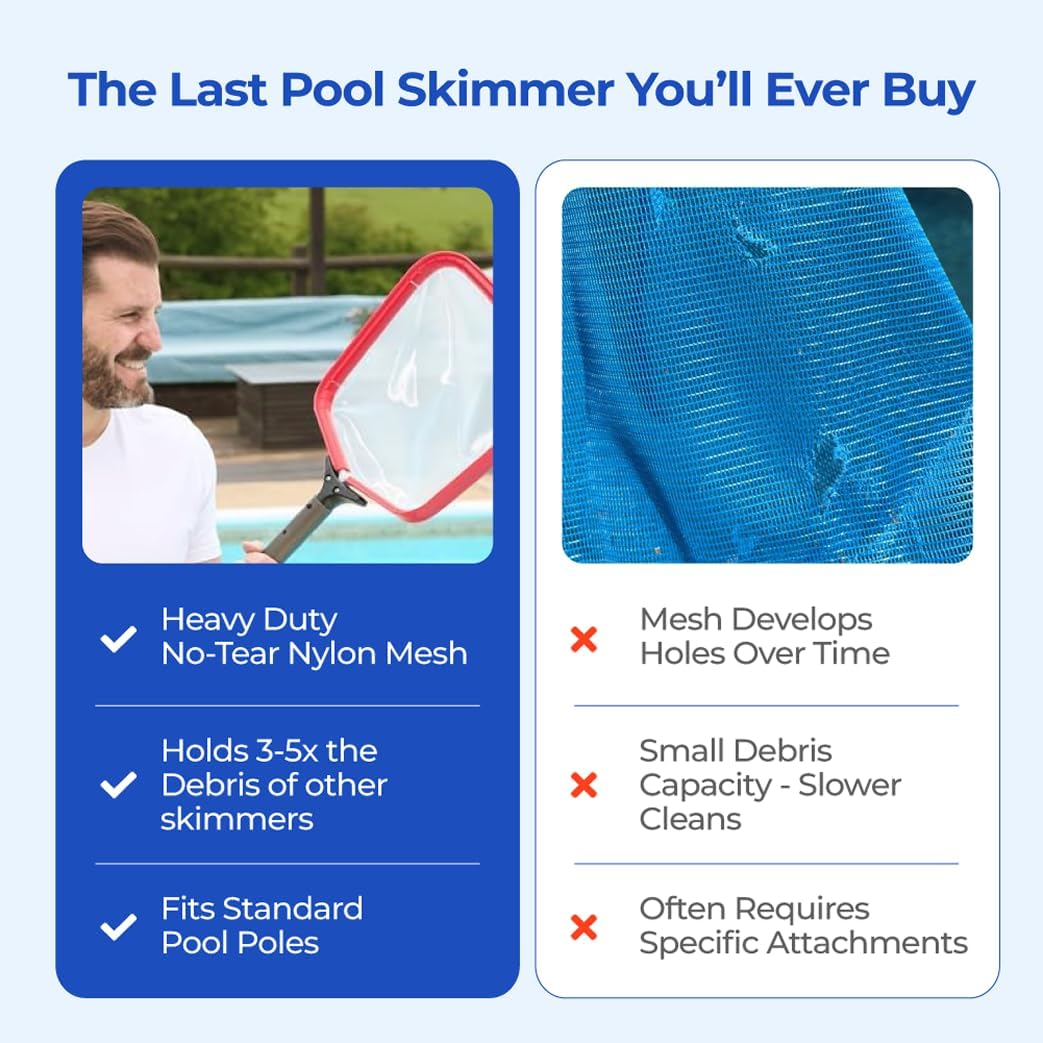 - PROTECTS ALL POOL SURFACES – Our heavy-duty pool skimmer net fine mesh features a plastic rim that prevents scratches on delicate surfaces. Perfect for use as a spa skimmer for hot tub, this fine mesh pool skimmer net ensures gentle yet effective debris removal for all pools, spas, and hot tubs.