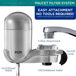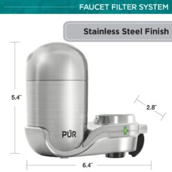 - PUR ADVANCED FAUCET WATER FILTER: PUR Advanced Faucet Filter in Stainless Steel Style attaches to your sink faucet, for easy, quick access to cleaner, great-tasting water. An LED indicator displays filter status, so you know when it needs replacement