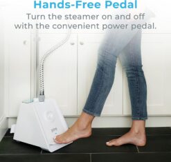- PORTABLE, PEDAL-POWERED STEAMING: There’s no need to hold a cumbersome steam button or manually pump the nozzle for steam output. Use the pedal at the base to easily turn the steamer on and off. The adjustable pole allows you to change the height, while the wheels on the bottom let you take this standing steamer with you anywhere.