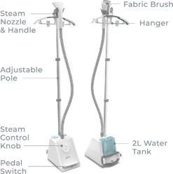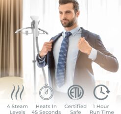 - STANDING GARMENT STEAMER: This superior steamer heats in only 45 seconds to deliver up to 1500 watts of safe, thermostat-controlled steaming power reaching 208℉. Four steaming levels tackle all kinds of stubborn wrinkles, while the 2L tank allows for a full hour of continuous steaming.