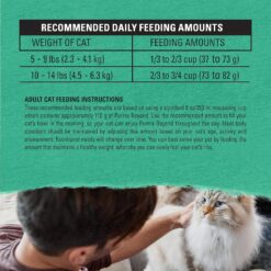 ADULT CAT FEEDING INSTRUCTIONS These recommended feeding amounts are based on using a standard 8 oz/250 ml measuring cup which contains approximately 110 g of Purina Beyond. Use the recommended amount to fill your cat’s bowl in the morning, so your cat can enjoy Purina Beyond throughout the day. Ideal body condition should be maintained by adjusting this amount based on your cat’s age, activity and environment. Nutritional needs will change over time. You can best serve your pet by feeding the amount that maintains a healthy weight, whereby you can easily feel your cat’s ribs. MAKING THE SWITCH TO PURINA BEYOND Although you’ll be anxious to see the difference Purina Beyond can make in your cat, please allow 7 – 10 days to ease the transition from your cat’s current food. This will help avoid stomach upset. Each day, simply feed a little less of the previous food and a little more Purina Beyond until you’re feeding Purina Beyond exclusively. NO SUPPLEMENTS NECESSARY Purina Beyond provides 100% complete and balanced nutrition for adult cats. There is no need to add vitamins, minerals or other supplements, unless specifically directed by a veterinarian. FRESH WATER, PROPER DIET & VETERINARY CARE Be sure to provide fresh water in a clean container for your cat daily. Proper diet, exercise and veterinary care are the best ways to keep your cat healthy. If your cat hasn’t had a check-up in the past year, please make an appointment today. Contains a source of live (viable) naturally occurring microorganisms.
