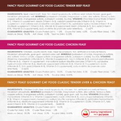 Give your kitty paw-some, tasty variety with Fancy Feast Classic Collection Chicken & Beef Pate Variety Pack Canned Cat Food. Three delicious gourmet recipes feature real beef, chicken and liver for protein-rich nutrition that supports strong muscle development. A meow-worthy, tender pate texture encourages your furbaby to lick her dish clean. These recipes are grain-free, purr-fect for cats with diet sensitivities or restrictions. Each meal delivers complete and paw-some balanced nutrition. This food contains essential vitamins and minerals to support your feline friend’s health.