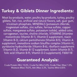 Breed Recommendation All Breed Sizes - IngredientsMeat by-products, water, poultry by-products, turkey, poultry giblets, fish, rice, artificial and natural flavors, salt, guar gum, tricalcium phosphate, MINERALS [potassium chloride, magnesium sulfate, zinc sulfate, ferrous sulfate, copper sulfate, manganese sulfate, potassium iodide], added color, carrageenan, taurine, choline chloride, VITAMINS [thiamine mononitrate (Vitamin B-1), Vitamin E supplement, niacin (Vitamin B-3), calcium pantothenate (Vitamin B-5), Vitamin A supplement, menadione sodium bisulfite complex (Vitamin K), pyridoxine hydrochloride (Vitamin B-6), riboflavin supplement (Vitamin B-2), Vitamin B-12 supplement, biotin (Vitamin B-7), folic acid (Vitamin B-9), Vitamin D-3 supplement]. F606118