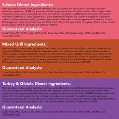 Classic Pate Salmon Dinner: Crude Protein (Min)10.0 percent, Crude Fat (Min)5.0 percent, Crude Fiber (Max)1.0 percent, Moisture (Max)78.0 percent, Ash (Max)3.0 percent, Taurine (Min)0.05 percent. Classic Pate Mixed Grill: Crude Protein (Min)10.0 percent, Crude Fat (Min)5.0 percent, Crude Fiber (Max)1.0 percent, Moisture (Max)78.0 percent, Ash (Max)3.0 percent, Taurine (Min)0.05 percent. Classic Pate Turkey & Giblets Dinner: Crude Protein (Min)10.0 percent, Crude Fat (Min)5.0 percent, Crude Fiber (Max)1.0 percent, Moisture (Max)78.0 percent, Ash (Max)3.0 percent, Taurine (Min)0.05 percent.