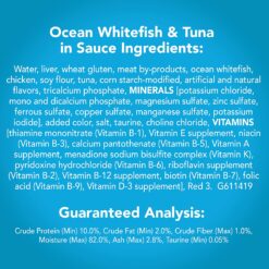 Water, Liver, Wheat Gluten, Meat By-Products, Ocean Whitefish, Chicken, Soy Flour, Tuna, Corn Starch-Modified, Artificial And Natural Flavors, Tricalcium Phosphate, MINERALS [Potassium Chloride, Mono And Dicalcium Phosphate, Magnesium Sulfate, Zinc Sulfate, Ferrous Sulfate, Copper Sulfate, Manganese Sulfate, Potassium Iodide], Added Color, Salt, Taurine, Choline Chloride, VITAMINS [Thiamine Mononitrate (Vitamin B-1), Vitamin E Supplement, Niacin (Vitamin B-3), Calcium Pantothenate (Vitamin B-5), Vitamin A Supplement, Menadione Sodium Bisulfite Complex (Vitamin K), Pyridoxine Hydrochloride (Vitamin B-6), Riboflavin Supplement (Vitamin B-2), Vitamin B-12 Supplement, Biotin (Vitamin B-7), Folic Acid (Vitamin B-9), Vitamin D-3 Supplement], Red 3. G611419.
