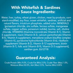 Water, liver, turkey, wheat gluten, chicken, meat by-products, corn starch-modified, soy flour, ocean whitefish, sardines, artificial and natural flavors, tricalcium phosphate, added color, MINERALS [potassium chloride, zinc sulfate, ferrous sulfate, manganese sulfate, copper sulfate, potassium iodide], taurine, salt, choline chloride, VITAMINS [thiamine mononitrate (Vitamin B-1), Vitamin E supplement, niacin (Vitamin B-3), calcium pantothenate (Vitamin B-5), Vitamin A supplement, menadione sodium bisulfite complex (Vitamin K), pyridoxine hydrochloride (Vitamin B-6), riboflavin supplement (Vitamin B-2), Vitamin B-12 supplement, biotin (Vitamin B-7), folic acid (Vitamin B-9), Vitamin D-3 supplement], xanthan gum. E612718