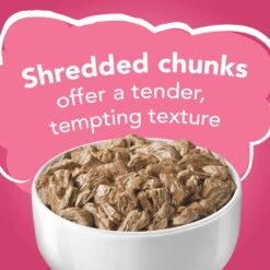 Features shredded chunks of poultry, meat or fish and savory gravy or juice.
