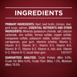 Beef, beef broth, chicken, liver, pork lungs, salmon, MINERALS [potassium chloride, zinc sulfate, ferrous sulfate, copper sulfate, manganese sulfate, potassium iodide, sodium selenite], carrageenan, guar gum, salt, locust bean gum, choline chloride, VITAMINS [Vitamin E supplement, thiamine mononitrate (Vitamin B-1), niacin (Vitamin B-3), calcium pantothenate (Vitamin B-5), pyridoxine hydrochloride (Vitamin B-6), Vitamin B-12 supplement, riboflavin supplement (Vitamin B-2), Vitamin A supplement, folic acid (Vitamin B-9), Vitamin D-3 supplement, biotin (Vitamin B-7)].