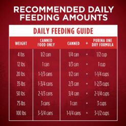 Use the chart as a guideline and adjust the feeding amount as needed to maintain your dog in ideal body condition. Divide daily amount into multiple feedings. Your dog’s needs may vary according to age, activity level and environment. Always provide fresh water in a clean container. Proper diet, exercise and veterinary care are the best ways to keep your dog healthy. Refrigerate unused portions.
