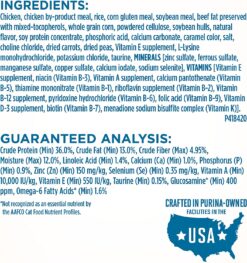 Chicken, Chicken By-Product Meal, Rice Flour, Corn Gluten Meal, Soybean Meal, Beef Fat Preserved With Mixed-Tocopherols, Whole Grain Corn, Powdered Cellulose, Soybean Hulls, Natural Flavor, Soy Protein Concentrate, Phosphoric Acid, Calcium Carbonate, Caramel Color, Salt, Potassium Chloride, Choline Chloride, Dried Carrots, Dried Peas, VITAMINS [Vitamin E Supplement, Niacin (Vitamin B-3), Vitamin A Supplement, Calcium Pantothenate (Vitamin B-5), Thiamine Mononitrate (Vitamin B-1), Riboflavin Supplement (Vitamin B-2), Vitamin B-12 Supplement, Pyridoxine Hydrochloride (Vitamin B-6), Folic Acid (Vitamin B-9), Vitamin D-3 Supplement, Biotin (Vitamin B-7), Menadione Sodium Bisulfite Complex (Vitamin K)], Taurine, MINERALS [Zinc Sulfate, Ferrous Sulfate, Manganese Sulfate, Copper Sulfate, Calcium Iodate, Sodium Selenite], L-Lysine Monohydrochloride.