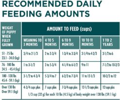 Fresh Water, Proper Diet & Veterinary Care: Be sure to provide fresh water in a clean container for your dog daily. Proper diet, exercise and veterinary care are the best ways to keep your dog healthy. Please allow 7-10 days to ease the transition from your dog’s current food. Each day, simply feed a little less of the previous food and a little more Purina ONE until you’re feeding Purina ONE exclusively. This gradual transition will help avoid dietary upsets. For best results, develop a regular feeding schedule, such as three small meals a day for younger puppies. Gradually reduce the one feeding in the morning to one in the evening as your puppy ages. The routine should not vary. Puppy Feeding: Start puppies on moistened Purina ONE as early as they will nibble at solid foods, generally 3-4 weeks of age. Allow your puppy to eat at will until fully weaned (6-8 weeks). After weaning, feed pups (to six months of age) all of the moistened or dry Purina ONE they will consume at intervals throughout the day. If water is added, use no more than one part warm (not hot) liquid to four parts Purina ONE, changing frequently to ensure freshness. If fed dry, this formula may be kept before pups at all times.