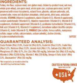 Turkey (Source of Glucosamine), Rice Flour, Soybean Meal, Corn Gluten Meal, Chicken By-Product Meal (Source of Glucosamine), Oat Meal, Whole Grain Wheat, Corn Germ Meal, Whole Grain Corn, Soybean Germ Meal, Beef Fat Naturally Preserved with Mixed-Tocopherols, Glycerin, Liver Flavor, Calcium Carbonate, Salt, Mono and Dicalcium Phosphate, Caramel Color, Dried Carrots, Dried Peas, Potassium Chloride, Vitamins [Vitamin E Supplement, Niacin (Vitamin B-3), Vitamin A Supplement, Calcium Pantothenate (Vitamin B-5), Thiamine Mononitrate (Vitamin B-1), Vitamin B-12 Supplement, Riboflavin Supplement (Vitamin B-2), Pyridoxine Hydrochloride (Vitamin B-6), Folic Acid (Vitamin B-9), Menadione Sodium Bisulfite Complex (Vitamin K), Vitamin D-3 Supplement, Biotin (Vitamin B-7)], Minerals [Zinc Sulfate, Ferrous Sulfate, Manganese Sulfate, Copper Sulfate, Calcium Iodate, Sodium Selenite], Choline Chloride, L-Lysine Monohydrochloride, Sulfur. E-4175.
