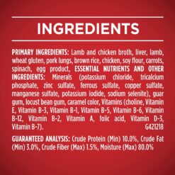 Lamb And Chicken Broth, Liver, Lamb, Wheat Gluten, Meat By-Products, Chicken, Brown Rice, Carrots, Soy Flour, Corn Starch-Modified, Spinach, Egg Product, Minerals [Potassium Chloride, Zinc Sulfate, Ferrous Sulfate, Copper Sulfate, Manganese Sulfate, Potassium Iodide, Sodium Selenite], Tricalcium Phosphate, Added Color, Vitamins [Vitamin E Supplement, Niacin (Vitamin B-3), Thiamine Mononitrate (Vitamin B-1), Calcium Pantothenate (Vitamin B-5), Pyridoxine Hydrochloride (Vitamin B-6), Vitamin B-12 Supplement, Riboflavin Supplement (Vitamin B-2), Vitamin A Supplement, Folic Acid (Vitamin B-9), Vitamin D-3 Supplement, Biotin (Vitamin B-7)], Choline Chloride. E-4212