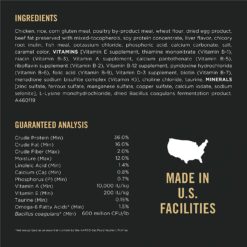 Chicken, Rice, Corn Gluten Meal, Poultry By-Product Meal, Wheat Flour, Dried Egg Product, Beef Fat Preserved With Mixed-tocopherols, Soy Protein Concentrate, Liver Flavor, Chicory Root Inulin, Fish Meal, Potassium Chloride, Phosphoric Acid, Calcium Carbonate, Salt, Caramel Color, Vitamins [Vitamin E Supplement, Thiamine Mononitrate (Vitamin B-1), Niacin (Vitamin B-3), Vitamin A Supplement, Calcium Pantothenate (Vitamin B-5), Riboflavin Supplement (Vitamin B-2), Vitamin B-12 Supplement, Pyridoxine Hydrochloride (Vitamin B-6), Folic Acid (Vitamin B-9), Vitamin D-3 Supplement, Biotin (Vitamin B-7), Menadione Sodium Bisulfite Complex (Vitamin K)], Choline Chloride, Taurine, Minerals [Zinc Sulfate, Ferrous Sulfate, Manganese Sulfate, Copper Sulfate, Calcium Iodate, Sodium Selenite], L-lysine Monohydrochloride, Dried Bacillus Coagulans Fermentation Product. A460119