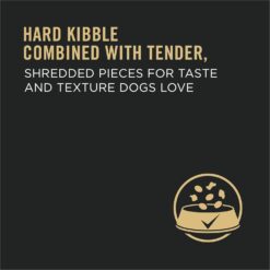 - Hard kibble dog food combined with tender, shredded pieces for taste and texture dogs love