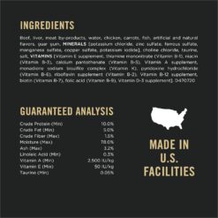 Crude Protein (Min)…10.0%, Crude Fat (Min)…5.0%, Crude Fiber (Max)…1.5%, Moisture (Max)…78.0%, Ash (Max)…3.2%, Taurine (Min)…0.05%.