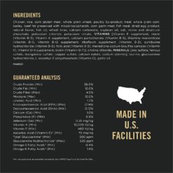 New: Chicken, Rice, Corn Gluten Meal, Whole Grain Corn, Poultry By-product Meal (Source Of Glucosamine), Whole Grain Wheat, Barley, Beef Fat Preserved With Mixed-tocopherols, Corn Germ Meal, Fish Meal (Source Of Glucosamine), Dried Egg Product, Natural Flavor, Fish Oil, Wheat Bran, Calcium Carbonate, Soybean Oil, Salt, Potassium Chloride, Mono And Dicalcium Phosphate, Potassium Citrate, Vitamins [Vitamin E Supplement, Niacin (Vitamin B-3), Vitamin A Supplement, Calcium Pantothenate (Vitamin B-5), Thiamine Mononitrate (Vitamin B-1), Vitamin B-12 Supplement, Riboflavin Supplement (Vitamin B-2), Pyridoxine Hydrochloride (Vitamin B-6), Folic Acid (Vitamin B-9), Menadione Sodium Bisulfite Complex (Vitamin K), Vitamin D-3 Supplement, Biotin (Vitamin B-7)], Choline Chloride, Minerals [Zinc Sulfate, Ferrous Sulfate, Manganese Sulfate, Copper Sulfate, Calcium Iodate, Sodium Selenite], Glucosamine Hydrochloride, L-ascorbyl-2-polyphosphate (Vitamin C), Dried Bacillus Coagulans Fermentation Product, Garlic Oil. L445119