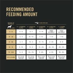 Using a standard 8 oz/250 ml measuring cup which contains approximately 108 g of Pro Plan. Puppies start to nibble solid foods at 3 – 4 weeks of age. Keep moistened Pro Plan available at all times. Allow your puppy to eat at will until fully weaned (6 – 8 weeks). After weaning, Pro Plan can be fed moistened or dry. For best results, develop a regular feeding schedule such as three small meals a day for younger puppies. You can gradually reduce to one feeding in the morning and one in the evening as your puppy ages. The routine should not vary. As puppies near adulthood, their calorie needs may drop, and your puppy may begin leaving some food in the bowl. Don’t misinterpret this as an indication of dislike for the food. Instead, begin offering less so your puppy doesn’t overeat and stays in ideal body condition. Nestlé Purina Research indicates that avoiding overfeeding of puppies may help their development. Maintaining ideal body condition is key to encouraging proper growth in all puppies, especially large breeds. The indicated amounts are only a guideline. If your puppy becomes overweight, a reduction of your puppy’s daily food intake may be appropriate. You may wish to consult your veterinarian about a weight control program. FEEDING FOR REPRODUCTION Pro Plan provides the extra nutrition needed by reproducing females in stages of gestation and lactation. Food consumption may vary during gestation, so feed the amount needed to maintain the pregnant female’s ideal body condition. Food intake may double or even quadruple during lactation. MAKING THE SWITCH TO PRO PLAN Although you’ll be anxious to see the difference Pro Plan can make in your dog, please allow 7 – 10 days to ease the transition from your dog’s current food. Each day, simply feed a little less of the previous food and a little more Pro Plan until you’re feeding Pro Plan exclusively. This gradual transition will help avoid dietary upsets. Provide adequate fresh water in a clean container daily. For your pet’s health, see your veterinarian regularly.